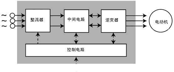變頻器是把工頻電源(50Hz或60Hz)變換成各種頻率的交流電源,以實現(xiàn)電機的變速運行的設備。如圖1所示,其中控制電路完成對主電路的控制,整流電路將交流電變換成直流電,直流中間電路對整流電路的輸出進行平滑濾波,逆變電路將直流電再逆變成交流電。對于如矢量控制變頻器這種需要大量運算的變頻器來說,有時還需要一個進行轉矩計算的CPU以及一些相應的電路。