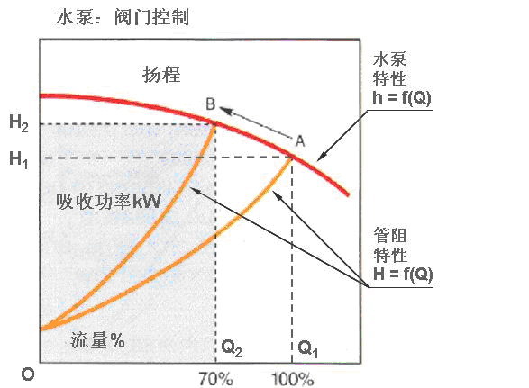 電機(jī)在恒速運(yùn)行時(shí),采取調(diào)節(jié)閥門的辦法獲得70%的流量(工作點(diǎn)為 B),將導(dǎo)致管阻增大,水泵軸功率相當(dāng)于Q2BH2O所包容的面積,所以軸功率下降不大。