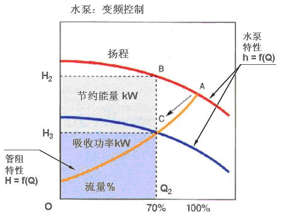 采用變頻調(diào)速控制流量時(shí),由于管道特性沒(méi)有改變,水泵特性發(fā)生變化(工作點(diǎn)為 C),軸功率與Q2CH3O所包容的面積成正比。故其節(jié)能量與CBH2H3所包容的面積成正比,輸入功率大大減小。 如圖3所示:
