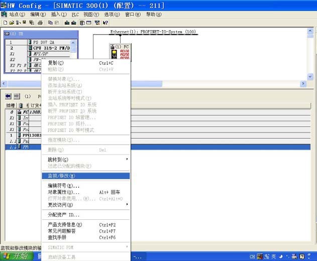 STEP7 硬件配置的 ONLINE 模式提供簡易的在線調試功能,可以操作現場變頻器, 檢查配置和接線是否正確。在 ONLINE 模式,PLC 運行狀態下,選中從站丹佛斯變頻器的 圖標,再點擊從站的 1.2 插槽,示例中顯示為“PPO 4 – 6/6 Words,Danf~”模塊,按鼠標 右鍵,選擇“監視/修改(M)”。