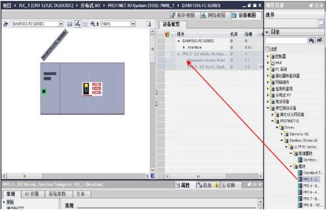七、:配置丹佛斯變頻器(進入‘網絡視圖’-打開右側‘硬件目錄’-選擇‘Danfoss Drives AS-前端模塊’-‘Danfoss-FC-SERIES’),如圖七所示: