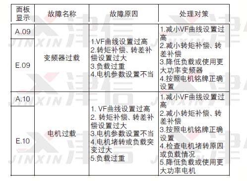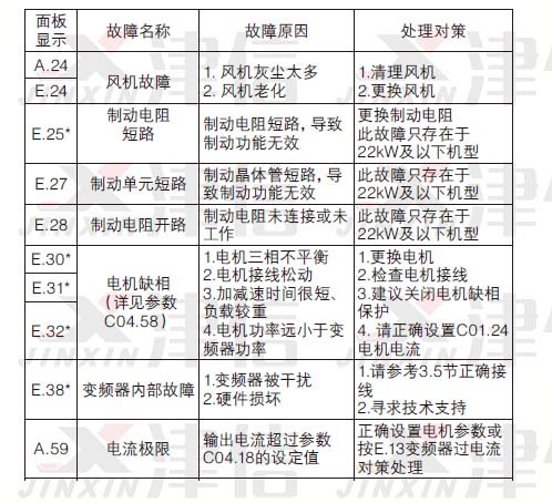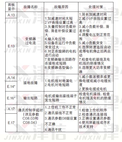 故障說明變頻器由于某種原因已經超過設計極限,故障發生后變頻器跳脫,必須復位才能重新運行。故障產生時,面板顯示“E.XX”(XX指數字)。