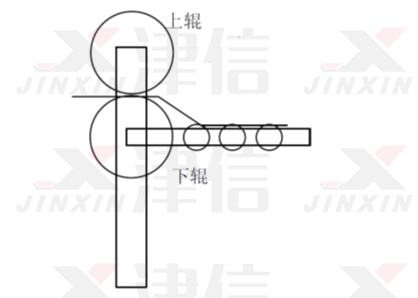 如圖中所示:設備采用了上下兩個壓輥,玻璃從兩個壓輥中間經過,完成壓延。在壓延過程中兩個輥需要同步,使玻璃平滑。