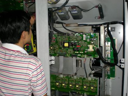 首先打開頂部風機蓋板,取出頂部4個散熱風機,露出散熱片,用空壓氣體清理散片。將散熱片清理干凈后,更換兩個損壞的風機 同時將剩下的兩個散熱風機也清理干凈。安裝好風機后,蓋好風機蓋板。將好的SOFTCHARGE CARD 、GATEDRIVE CARD安裝好,換上新的快速熔斷器和POWER CARD。最后將CONTROL CARD裝好。變頻器安裝完畢。再次檢查變頻器的各個部分器件好壞,檢查變頻器的外圍線路,確認滿足變頻器送電條件。給變頻器送電,發現變頻器散熱風機運行正常,開機輸出電壓平衡,帶負載運行正常。變頻器成功修復。