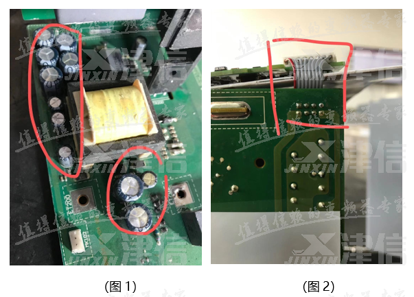 此機(jī)器在檢測(cè)時(shí)發(fā)現(xiàn),無(wú)24V電壓且風(fēng)機(jī)正常在運(yùn)行,經(jīng)過(guò)進(jìn)一步排查,發(fā)現(xiàn)電源卡到控制卡的排線(xiàn)有損壞,導(dǎo)致電源卡的24v電源未能正常傳送至控制卡上,從而測(cè)量出12號(hào)端子無(wú)24VDC。(排線(xiàn)如圖2所示)。