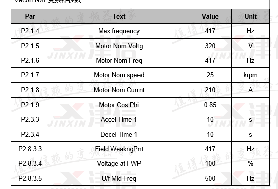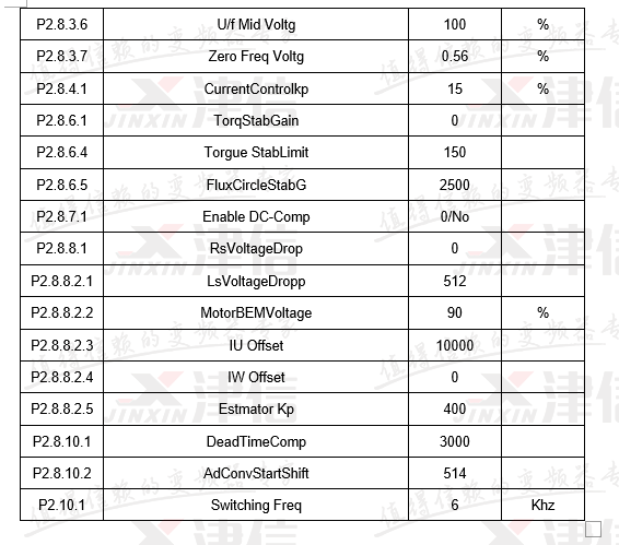 4) 設定變頻器的P2.1.5到P2.1.11的電機參數。