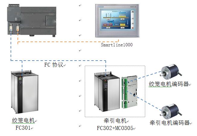 PLC的PORT1口與兩臺變頻器在一個總線上,采用FC協(xié)議進(jìn)行通信;PORT0則連接西門子的人機屏。其中牽引電機變頻器FC302上,安裝MCO305選件卡,同時將兩個電機的編碼器都接到MCO305上。由絞籠電機作為主軸,牽引電機作為從軸與主軸同步運動。
