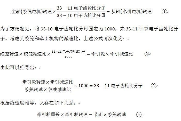 其中,絞籠轉(zhuǎn)速、節(jié)距由操作者給出,牽引輪周長、牽引減速比和絞線減速比取決于機械結(jié)構(gòu),由以上公式④推導(dǎo)出牽引輪轉(zhuǎn)速并帶入公式③,即可求出電子齒輪比分子,在計算的過程中須保證單位統(tǒng)一,計算出的電子齒輪比分子轉(zhuǎn)化為整數(shù)并通過FC協(xié)議寫入FC302的33-11參數(shù)。