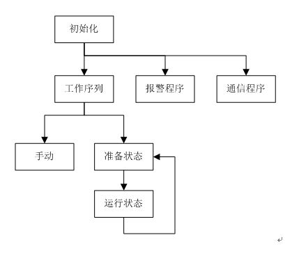 開機后,首先進(jìn)行通信和狀態(tài)的初始化。初始化完成后同時調(diào)用工作序列、報警和通信子程序。工作序列中,包含手動和自動兩種狀態(tài),自動運行又包括機組準(zhǔn)備(包括:松開機械抱閘、關(guān)閉防護(hù)門等動作)和機器運行兩個狀態(tài)。報警程序用于對機器狀態(tài)進(jìn)行實時監(jiān)控,并根據(jù)故障情況執(zhí)行相關(guān)動作。通信程序用于PLC和變頻器的FC協(xié)議通信。