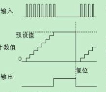 計(jì)數(shù)器的工作時(shí)序圖如圖二,當(dāng)產(chǎn)品數(shù)量計(jì)數(shù)到達(dá)預(yù)設(shè)值時(shí),計(jì)數(shù)器數(shù)字量輸出信號(hào)動(dòng)作,中止主機(jī)運(yùn)行。等用戶(hù)將計(jì)數(shù)器復(fù)位以后,主機(jī)又可以再次運(yùn)行。