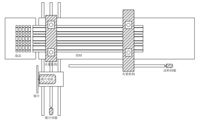 1.夾緊機(jī)構(gòu):機(jī)械中包含兩個夾緊機(jī)構(gòu)用于夾緊型材,一個負(fù)責(zé)在鋸切的時候防止型材移位,另一個由送料伺服帶動,用于帶動型材完成型材進(jìn)給。