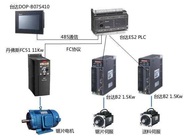 臺達(dá)ES2 PLC自帶兩組高速脈沖用于控制伺服,最高頻率到達(dá)100KHz,同時滿足了精度和速度的要求。ES2 PLC帶有兩組RS485通信口,分別與DOP-B07S410觸摸屏和FC51變頻器通信。