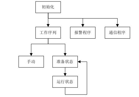 開機(jī)后,首先進(jìn)行通信和狀態(tài)的初始化。初始化完成后同時調(diào)用工作序列、報警和通信子程序。工作序列中,包含手動和自動兩種狀態(tài),自動運行又包括單次鋸切和連續(xù)鋸切兩種工作模式。報警程序用于對機(jī)器狀態(tài)進(jìn)行實時監(jiān)控,并根據(jù)故障情況執(zhí)行相關(guān)動作。通信程序用于PLC和變頻器的FC協(xié)議通信,實現(xiàn)運行狀態(tài)和報警信息的監(jiān)控。