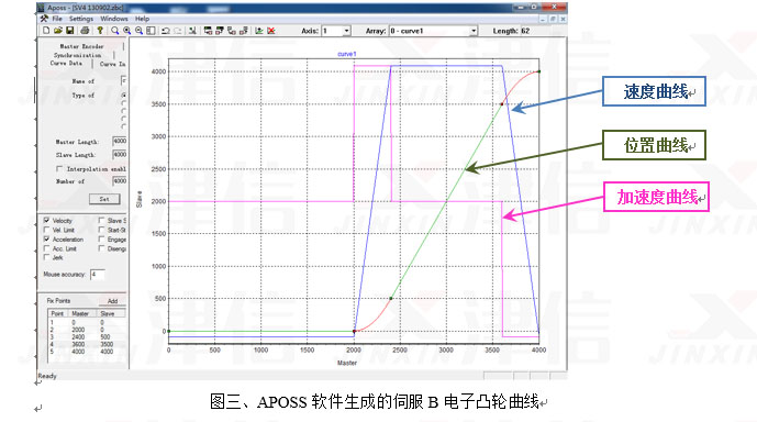 丹佛斯MCO305的開發軟件為APOSS,內置電子凸輪曲線生產功能,加上述計算得到的a、b、c、d、e 五點電子凸輪曲線特征點按軟件要求填入表格,就能自動生成如圖三所示的電子凸輪曲線。