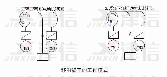 移船絞車是重要的海工設(shè)備,在海上工作平臺(tái)、鋪管船里有廣泛的應(yīng)用。移船絞車的工況與起升相似,正轉(zhuǎn)時(shí)收線,變頻器工作于電動(dòng)機(jī)模式,電機(jī)對(duì)負(fù)載作功;反轉(zhuǎn)時(shí)放線,變頻器工作于發(fā)電機(jī)機(jī)模式,負(fù)載對(duì)電機(jī)做功,要求變頻器內(nèi)置制動(dòng)晶體管。與普通起升不同的是,移船絞車連續(xù)工作時(shí)間很長(數(shù)小時(shí)),所以對(duì)于變頻器的過載能力要求不高,但是要求變頻器具有100%制動(dòng)轉(zhuǎn)矩連續(xù)運(yùn)行的能力。