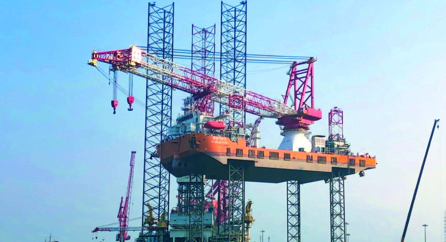 “海龍興業”號風電安裝平臺是目前國內最新型高端風電安裝平臺,是我國第一座采用桁架式齒輪齒條升降設計的平臺,可用于7兆瓦及以下海上風機的安裝作業。
